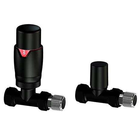 Matching straight matt black thermostatic radiator valves complement our range of heated towel rails and radiators. Beautifully engineered to integrate into any modern or minimalist bathroom. A thermostatic radiator valve allows you to control the heat output of an individual radiator or heated towel rail. The head contains a temperature sensor which controls the opening and closing of the valve thereby keeping the room at a constant temperature.