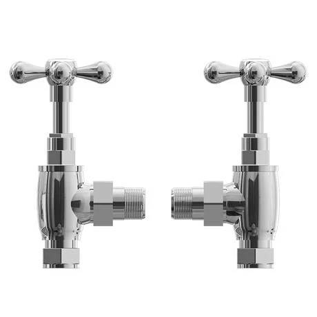 Manufactured from solid brass for durability, these Angled Cross Head Radiator Valves re a great choice for any traditional radiator with side inlets. They feature attractive chrome plating and each crosshead handle includes a white ceramic cap at its centre for a sophisticated look. As manual valves, they’re simple to use too – just twist the handle to adjust the temperature to your liking. These chrome radiator valves come complete with decorative pipes and concealing plates to tie your bathroom together.