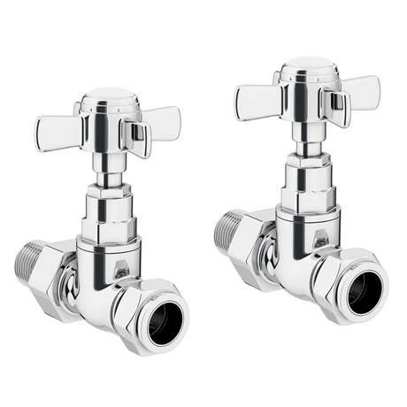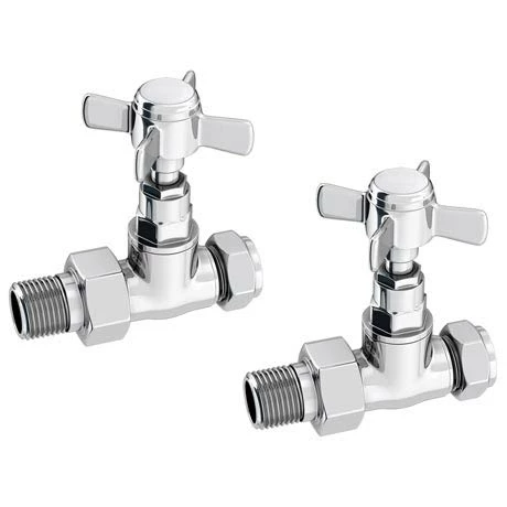 Pair of matching straight traditional cross head radiator valves. Designed to complement our range of traditional heated towel rails. Beautifully engineered to integrate into any period bathroom. Finished in polished chrome and manufactured from durable brass.
